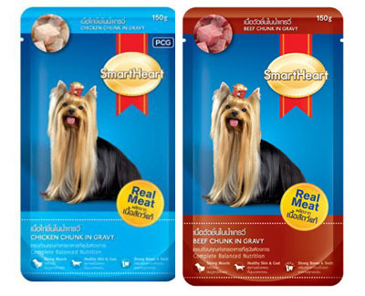 อาหารสุนัขราคาพิเศษ SmartHeart เนื้อวัวชิ้นในน้ำเกรวี่, เนื้อไก่ชิ้นในน้ำเกรวี่