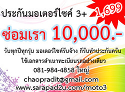 รับทำประกันมอเตอร์ไซค์ 3+ ซ่อมรถเรา 10,000.- ราคา 1699 ครับ