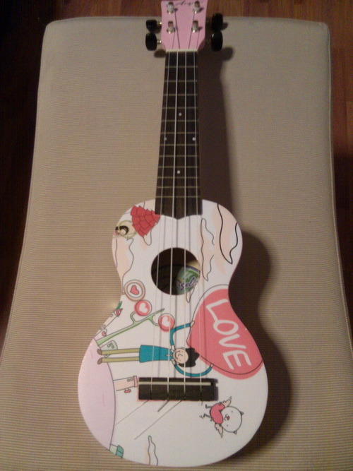 ขาย กีตาร์ Ukulele ยี่ห้อ Angel สีชมพูลายการ์ตูน size soprano ราคา 2500 บาท พร้อมถุงใส่กีตาร์สีชมพู ฟรี สนใจติดต่อ 085-1492800 ( หมี )