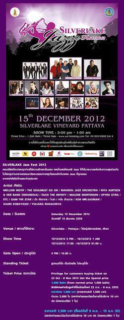 บัตรคอนเสริต์ Silverlake Jazz Fest 2012 @ไร่องุ่นซิลเวอร์เลค พัทยา มูลค่าใบละ 1,500 ขายเพียง 750 บาท ( 4 ใบ )
