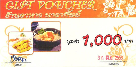ขายบัตรทานอาหาร ร้านนาราทิพย์ ราคาใบละ 1,000 บาท ลดเหลือ 500 บาท ด่วน! มีจำนวนจำกัด สอบถามรายละเอียดเพิ่มเติม โทร. 089-8892148 www.kadmua.com