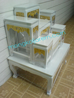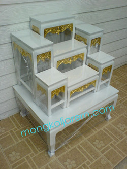 จำหน่าย โต๊ะหมู่บูชาไม้ยาง หน้า 6 หมู่ 7 สีครีม ประดับกระจังทอง ( ปิดทองที่กระจัง ) สนใจโทร 081-9183588 คุณหวาน