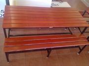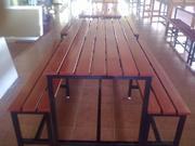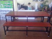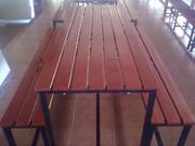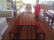 ลูกค้านิยม สั่งกันใช้โดยเฉพาะโรงเรียนและบริษัทโรงงานต่างๆ โต๊ะขนาด 70*180 ซม. สูง ประมาณ 73-75 ซม. ที่นั่งขนาด 30*180 ซม.สูง 43-44 ซม. โครงทำจากเหล็กกลมขนาด 42.7 ซม. โต๊ะใช้ไม้เต็ง 7 ตัว เก้าอี้ข้างละ 3 ตัว ไม้แต่ละแผ่นหนา-ประมาณ 1 นิ้ว หน้า 4 นิ้ว ( 9 ซม. ) ป้องกันแมลงแล้วทาด้วยเลคเกอร์เงา