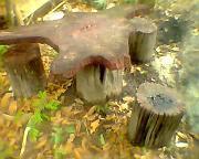 ไม้มะค่า ประกอบด้วย ขอนไม้ใหญ่ วางบนแผ่นไม้รูปร่างดังรูป ขอนไม้เล็กเป็นที่นั่ง 3 ตัว ไม้เนื้อหนา ไม้มะค่าแท้