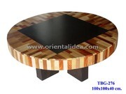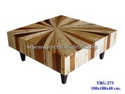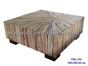 รหัสสินค้า : TBG-194 ขาและโครงสร้างภายในเป็นไม้เนื้อแข็ง แข็งแรงรองรับน้ำหนักได้มาก ด้านข้างปิดด้วยแผ่นไม้เนื้อแข็งโดยรอบโต๊ะ หน้าโต๊ะทำจากแผ่นไม้เนื้อแข็งที่ตัดเป็นทรงโค้งเรียงเข้าหาจุดศูนย์กลาง ทำให้เกิดลายไม้แบบแปลกใหม่ขึ้นมา สวยมาก เหมาะจะใช้เป็นโต๊ะกลางหรือโต๊ะกาแฟ ขนาด : 100x100x40 cm.