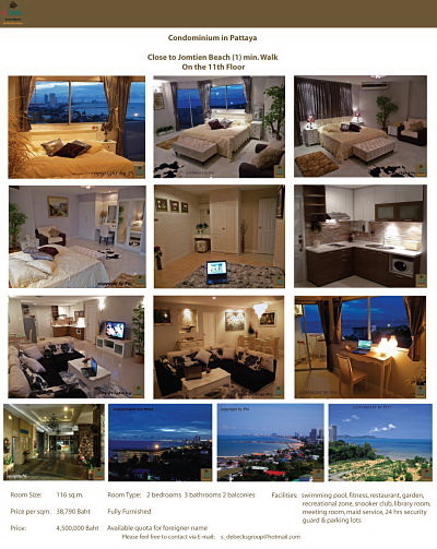 วิวทะเล เนื้อที่ 116 ตรม. 2ห้องนอน 3ห้องน้ำ 2ระเบียง ราคาต่อ ตรม. 38,790 บาท ราคา 4,500,000 บาท พร้อมเฟอร์นิเจอร์นำเข้าอย่างดีครบชุด เครื่องใช้ไฟฟ้าครบชิ้น รวมทั้งทีวี แอลซีดี 42 นิ้ว ได้วิว 2 ฝั่ง จากห้องนั่งเล่นและภายในห้องนอน จะเห็นวิวโค้งทั้งอ่าวพัทยา สระว่ายน้ำ Infinity edge สุดหรูขนาดมาตรฐาน พร้อมสระเด็ก ห้องฟิตเนส ห้องโยคะ พร้อมอุปกรณ์ทันสมัย ห้องสตีมและซาน์น่า ห้องอาบน้ำ ห้องเปลี่ยนเครื่องแต่งกายพร้อมล๊อคเกอร์แยกชาย-หญิง ห้องสมุด ห้องกิจกรรมอเนกประสงค์ พื้นที่สวนพร้อมลู่จ็อกกี้ Sky garden สนใจติดต่อ คุณกี้ 082 339-3751 ไม่รับเอเจ้นต์ Condo in Pattaya Close to Jomtien Beach Room Size: 116 sq.m. Price per sqm. 38,790 Baht Price: 4,500,000 Baht Room Type: 2 bedrooms 3 bathrooms 2 balconies Excellent design with LCD 42' Nice atmosphere & peaceful area at Jomtien beach Full facilities - swimming pool, fitness, restaurant, garden, recreational zone, snooker club, library room, meeting room, maid service, 24 hrs security guard & parking