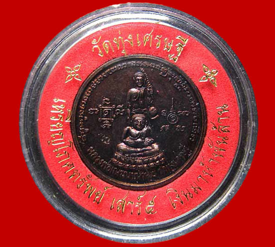 เหรียญโภคทรัพย์ เสาร์ 5 วัดทุ่งเศรษฐี รุ่นเงินมาห้าพันล้าน ปี 43 บูชาเสริมเงินทอง ด้านหน้าคือพระสีวลี พระสังกัจจายน์ ด้นหลัง แม่นางกวัก พิธีพุทธาภิเษก 9 วัน9 คืน พระเกจิอาจารย์ร่วมปลุกมากมาย อาทิเช่น สมเด็จพระญาณสังวร สมเด็จพระสังฆราชฯ วัดบวรนิเวศวิหาร หลวงปู่หมุน วัดป่าหนองหล่ม หลวงปู่อิง วัดโคทม หลวงปู่เคน วัดแซ่อุดมสุข หลวงปู่ทิม วัดพระขาว หลวงพ่ออุตตะ วัดวังวิเวกการาม หลวงพ่อพูน วัดบ้านแพน หลวงพ่อช่วย วัดสามมุข หลวงพ่อพระธรรมสิริชัย วัดอรุณวราราม หลวงปู่พรหม วัดเขาหินสวนลอย พระจากพม่า หลวงพ่อเณร วัดประทานพร จ.เชียงใหม่ พระอาจารย์ปราณี วัดเทพปราณี หลวงพ่อแดง วัดทุ่งลานนา หลวงปู่บุญ วัดทุ่งเหียง หลวงพ่อฤาษี จากประเทศลาว 2 องค์ เป็นต้น มีกล่องเดิม
