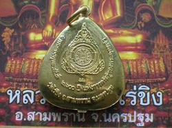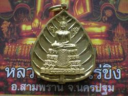 เหรียญงานฉลองพุทธชยันตี ๒๖๐๐ ปี แห่งการตรัสรู้ของพุทธเจ้า หลวงพ่อไร่ขิง จ.นครปฐม (เนื้อกะหลั่ยทอง)