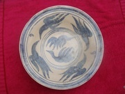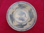 จานโบราณเวียงกาหลง ศิลปะสมัยล้านนา ดินเผาเคลือบใส ศตวรรษที่ 21-22 เส้นผ่านศูนย์กลางยาว 23.7 cm. สูง 4.5 cm. ในจานเขียนลายสีน้ำเงินอมดำนกกา 6 ตัว ในวงกลม 2 ชั้น สภาพสมบูรณ์ แตกลาน ของแท้ 100%หายากมาก ราคา 5,500 บาท
