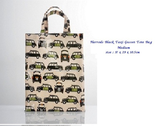 Harrods Black Taxi Gusset Tote Bag (medium) This glossy-coated cotton Harrods medium tote bag is finished with an iconic Black Taxi motif. A handy sized tote bag that is ideal for shopping or days out. Black Taxi medium tote Double strap handle PVC coating H37cm x W29cm x D10.5cm Handle drop: 12cm Pure cotton Wipe clean with damp cloth