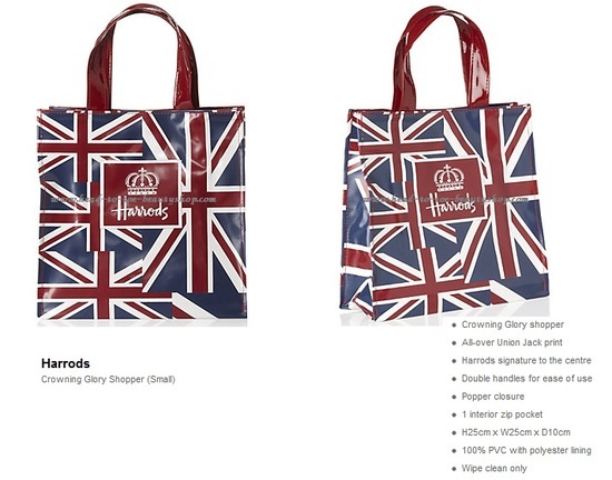 Harrods Crowning Glory Shopper (small) พร้อมส่ง Crowning Glory shopper All-over Union Jack print Harrods signature to the centre Double handles for ease of use Popper closure 1 interior zip pocket H25cm x W25cm x D10cm 100% PVC with polyester lining Wipe clean only