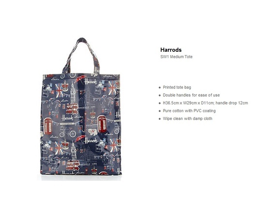 Harrods SW 1 Medium Tote พร้อมส่งค่ะ Printed tote bag Double handles for ease of use H36.5cm x W29cm x D11cm; handle drop 12cm Pure cotton with PVC coating Wipe clean with damp cloth
