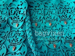 โดดเด่น สะดุดตา ด้วยหนัง PU ฉลุลายหัวกะโหลก และสายสะพายสีฟ้า ที่บิดเป็นเกลียวเชือกสวยงาม
