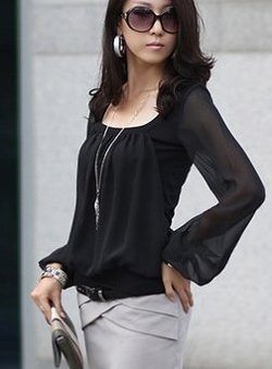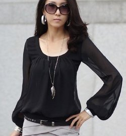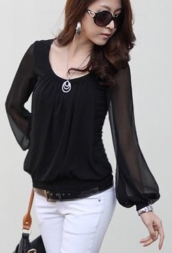 เสื้อแฟชั่น สไตล์ เกาหลี :เสื้อชีฟอง สีดำ คอกลมแขนยาว จั๊มเอว ขนาด : รอบอก 84 ซม. แขนยาว 56 ซม. ความยาว 52 ซม.