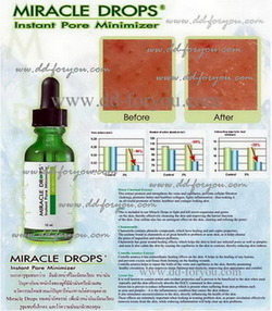 Miracle Drops (Instant Pore Minimizer) ปราศจากน้ำหอม Description : An oil-free, non-acnegenic crystal clear remedy. Effectively improves your complexion by reducing the appearance of enlarged pores. Instantly resolves debris & impurities. Particularly suited for adult acne prone skin. Usage : After cleansing apply a few drops on fingertips and cover facial areas that require attention. Apply twice daily for maximum skin strengthening. Follow with daily moisturizer.