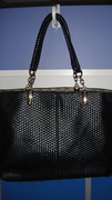 กระเป๋าหนังสีดำมีลายในตัว ขนาด 11*16 นิ้ว ด้านในมีลวดลายสีน้ำตาลอ่อน สามารถพลิกมาเป็นลายด้านนอกได้ มีตัวลูกกระเป๋าข้างในถอดได้ มีสายสะพายแยกต่างหาก