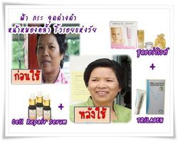 ของ ไทรลาเจน -HYDROLYZED WHEAT PROTEIN เป็นโปรตีนที่ประกอบด้วยกรดอะมิโนที่จำเป็นต่อร่างกายในปริมาณที่สูงถึง 60 % โปรตีนนี้จะเข้าไปฟื้นสภาพเซลล์ผิวหนังทั้งชั้นหนังกำพร้า และหนังแท้ ทำให้มีความหนาอวบอิ่มและยึดหยุ่นตัวมากขึ้นโปรตีนนี้สกัดได้จากข้าวสาลีจึงมีความปลอดภัยสูง -Tripeptide-1ช่วยกระตุ้นการสร้างคอลลาเจนใต้ผิวหนัง คลายกล้ามเนื้อที่เกิดจาก การแสดงอารมณ์ และจากการเสื่อมของเซลล์ผิวหนังทำให้ริ้วรอยจางลง อย่างมีประสิทธิภาพ -Artemia Salina Extract สารสกัดจากแพลงตอนทะเล Cell Protector, Cell Energizer, Cell Revitalizer ช่วยซ่อมแซม ฟื้นฟู และเพิ่มพลังงานให้แก่เซลล์ผิว -Palmitoyl Pentapeptide-4กระตุ้นการผลิต คอลลาเจนและอีลาสตินให้มากขึ้น -Lactococcus Ferment ประกอบด้วยกลุ่มโปรตีน อะมิโน เอซิด (amino acid) หลากหลายชนิดที่ประกอบอยู่ภายในผิวของเราอยู่แล้ว ดังนั้นจึงจัดว่าเป็น “ Bio-amino skin Food substance” โดยจะช่วย 1. บำรุงและทดแทนผิวที่สูญเสีย ความแข็งแรงจาก มลภาวะ สารพิษ หรือสาร ก่อระคายเคืองต่างๆ รวมทั้งยังทำให้ผิวมีความยืดหยุ่น แข็งแรง เกิดการสร้าง เซลล์ผิวใหม่ทดแทนเซลล์ผิวเก่าอย่างรวดเร็ว (Regenerating of skin cells) 2. ทำให้ผิวชุ่มชื่น เนียนนุ่ม แลดูอ่อนเยาว์ เนื่องจาก Lactococcus Ferment อุดมไปด้วยแร่ธาตุที่จำเป็นและประกอบอยู่ภายในผิวของเรา หลังการใช้อย่างต่อเนื่อง ผิวของเราแลดูเปล่งปลั่ง อ่อนเยาว์ กระจ่างใส 3. Lactococcus Ferment อุดมด้วย Lactic acid จึงช่วยเร่งการผลัดเซลล์ ผิวเก่า กระตุ้นการเกิดเซลล์ผิวใหม่ -HAMAMELIS VIRGINIANA EXTRACT บำรุงผิวให้แลดูเนียน เรียบ สดใสช่วยขจัดสิ่งสกปรกที่อุดตันรูขุมขนและความมัน ส่วนเกิน พร้อมช่วยกระชับรูขุมขนให้เรียบเนียน เพื่อผิวที่สดชื่นอย่างมีสุขภาพดี -collagen hydrolysate บำรุงผิว ลดริ้วรอยต่างๆ ช่วยให้ผิวหนังชุ่มชื่น กระชับ เรียบเนียน เปล่งปลั่ง ลดริ้วรอย ให้ดูอ่อนเยาว์ขึ้น -Hyaluronic Acid (HA) ซ่อมแซมเซลล์ผิวที่ถูกทำลายและเร่งขบวนการหายของแผล วิธีใช้ ทาบางๆทั่วบริเวณใบหน้าและลำคอทุกวัน เช้า-ก่อนนอน ปริมาตรสุทธิ 15 ml…… สนใจติดต่อ : เล็กTel : 08-3932-0678 E-mail :