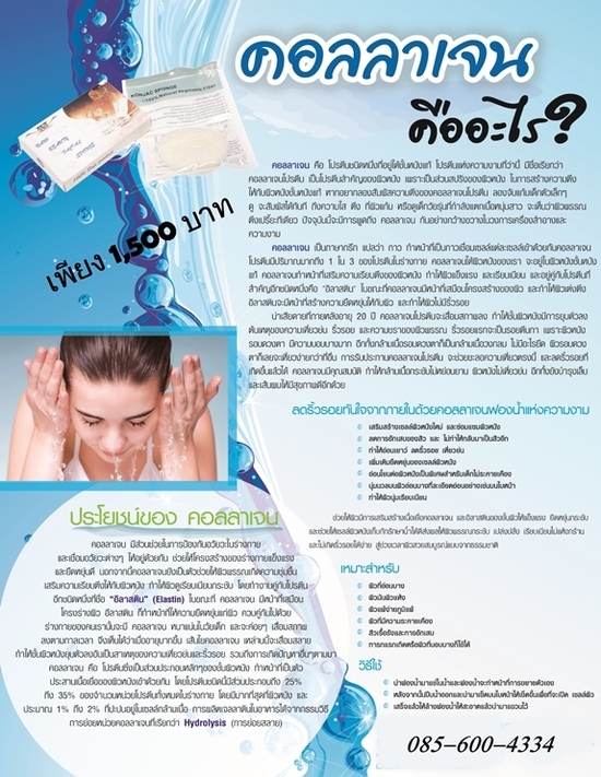 ลดริ้วรอยทันใจจากภายในด้วยคอลลาเจนฟองน้ำแห่งความงาม เสริมสร้างเซลล์ผิวหนังใหม่ และซ่อมแซมผิวหนัง ลดการอักเสบของสิว และ ไม่ทำให้กลับมาเป็นสิวอีก ทำให้อ่อนเยาว์ ลดริ้วรอย เหี่ยวย่น เพิ่มเติมยืดหยุ่นของเซลล์ผิวหนัง อ่อนโยนต่อผิวหนังเป็นพิเศษสำหรับเด็กไม่ระคายเคือง นุ่มนวลบนผิวอ่อนบางที่ละเอียดอ่อนอย่างเช่นบนใบหน้า ทำให้ผิวนุ่มเรียบเนียน ช่วยให้ผิวมีการเสริมสร้างเนื้อเยื่อคอลลาเจน และอิลาสตินของชั้นผิวให้แข็งแรงยืดหยุ่นกระชับ และช่วยให้เซลล์ผิวหนังเก็บกักรักษาน้ำได้ดีส่งผลให้ผิวพรรณกระชับเปล่งปลั่ง เรียบเนียนไม่แห้งกร้าน และไม่เกิดริ้วรอยได้ง่ายสู่ช่วงเวลาผิวสวยสมบูรณ์แบบจากธรรมชาติ เหมาะสำหรับ - ผิวที่อ่อนบาง - ผิวมันผิวแห้ง - ผิวแพ้ง่ายภูมิแพ้ - ผิวที่มีความระคายเคือง - สิวเรื้อรังและการอักเสบ - ทารกแรกเกิดหรือผิวที่บอบบางก็ใช้ได้ วิธีใช้ - นำฟองน้ำมาแช่ในน้ำและฟองน้ำจะทำหน้าที่การขยายตัวเอง - หลังจากนั้นปีบน้ำออกและนำมาเช็ดบนใบหน้าให้เช็ดขึ้นเพื่อที่จะเปิด เชลล์ผิว - เสร็จแล้วให้ล้างฟองน้ำให้สะอาดแล้วนำมาแขวนไว้ ห้ามนำไปตากแดด ประโยชน์ของ คอลลาเจน คอลลาเจน มีส่วนช่วยในการป้องกันอวัยวะในร่างกาย และเชื่อมอวัยวะต่างๆให้อยู่ด้วยกัน ช่วยให้โครงสร้างของร่างกายแข็งแรง และยืดหยุ่นดี นอกจากนี้คอลลาเจนยังเป็นตัวช่วยให้ผิวพรรณเกิดความชุ่มชื้นเสริมความเรียบตึงให้กับผิวหนัง ทำให้ผิวดูเรียบเนียนกระชับโดยทำงานคู่กับโปรตีน อีกชนิดหนึ่งที่ชื่อ “ อิลาสติน ” ( Elastin ) ในขณะที่คอลลาเจน มีหน้าที่เสมือนโครงร่างผิว อีลาสติน ก็ทำหน้าที่ให้ความยืดหยุ่นแก่ผิวควบคู่กันไปด้วย ร่างกายของคนเรานั้นจะมี คอลลาเจน หนาแน่นในวัยเด็ก และจะค่อยๆเสื่อมสภาพลงตามกาลเวลา จึงเห็นได้ว่าเมื่ออายุมากขึ้น เส้นใยคอลลาเจนเหล่านนี้จะเสื่อมสลายทำให้ชั้นผิวหนังยุบตัวลงอันเป็นสาเหตุของความเหี่ยวย่นและริ้วรอยรวมถึงการเกิดปัญหาอื่นๆตามมา คอลลาเจนคือ โปรตีนซึ่งเป็นส่วนประกอบหลักๆของชั้นผิวหนัง ทำหน้าที่เป็นตัวประสานเนื้อเยื่อของผิวหนังเข้าด้วยกัน โดยโปรตีนชนิดนี้มีส่วนประกอบถึง 25% ถึง 35% ของจำนวนหน่วยโปรตีนทั้งหมดในร่างกาย โดยมีมากที่สุดที่ผิวหนัง และ ประมาณ 1% ถึง 2% ที่ปะปนอยู่ในเซลล์กล้ามเนื้อ การผลิตเจลลาตินในอาหารได้จากกรรมวิธี การย่อยหน่วยคอลลาเจนที่เรียกว่า Hydrolysis(การย่อยสลาย) เรามาทำความรู้จักคอลลาเจนกันนะคะ คอลลาเจนคืออะไร ?? คอลลาเจนคือโปรตีนชนิดหนึ่งที่อยู่ใต้ชั้นหนังแท้ โปรตีนแห่งความงา