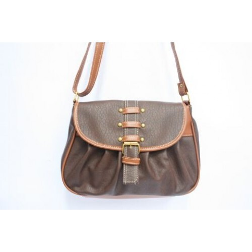 สายสะพายปรับระดับได้ ,ฝากระเป๋าปิดเปิดด้วยกระดุมแป๊บ แต่งทับด้วยเข็มขัดหนัง และมีหมุดทองเหลืองตกแต่ง 2 แถว