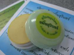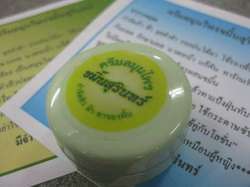 สรรพคุณ กำจัดสิว ฝ้า จุดด่างดำ รอยย่นใต้ตา ใช้รองฟื้นก่อนแต่งหน้า กันแดด รักษาแผล นวดหน้า แก้คัน ทารักแร้ ส้นเท้าแตก ไม่มีผลข้างเคียง เป็นสมุนไพรผสมขมิ้น วิธีใช้ แต้มหัวสิวบ่อย "ทาครีมแล้วทาแป้งฝุ่นทับ ทาครั้งแรกจะมีเหงื่อเล็กๆออกมานิดหน่อย ใช้กระดาษซับเบาๆ" ใช้ได้ทุกเวลา ทุกเพศทุกวัย ถ้าผิวแห้งใช้คู่กับโลชั่น