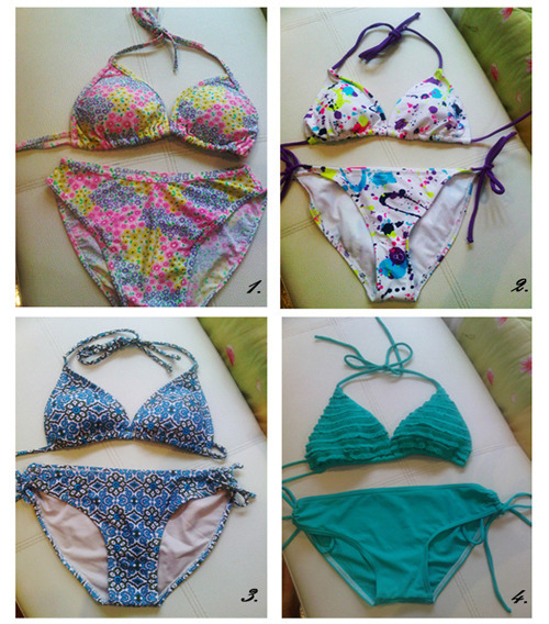 1. ชุดว่ายน้ำสีชมพูหวาน เป็นลายดอกไม้เล็กๆ ฟรีไซส์ค่ะ 400.- 2. ชุดว่ายน้ำสีม่วงลายสลัดสี ฟรีไซส์ค่ะ 550.- 3. ชุดว่ายน้ำสีฟ้าน้ำเงิน สำหรับสาวทรงเล็ก 530.- 4. ชุดว่ายน้ำสีเขียว ฟรีไซส์ค่ะ 590.- ---- สินค้ามือหนึ่งนะคะ ไม่เคยใส่ไม่เคยซักค่ะ แค่ลอง สั่งซื้อมาลองใส่แล้วหลวมค่ะ