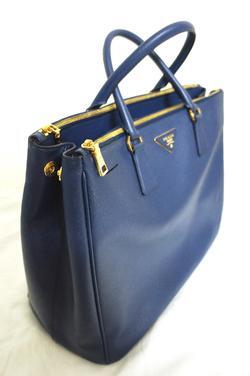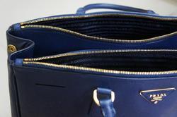 Genuine Prada Saffiano calf leather tote in cornflower blue (bluette), gold-tone hardware. Interior fully lined with Prada's signature fabric with 1 zipper compartment and Prada logo plate, Prada signature raised lettering triangular logo on the front. Top features 2 horizontal zipper compartments.