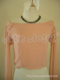 เสื้อ crop เปิดไหล่ตกแต่งโบว์ช่วงแขนผ้าชีฟองเนื้อทรายสีชมพูนู้ดสวย