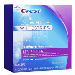 http://shoppingcenter.lnwshop.com/ Crest 3DWhite Whitestrips Stain Shield เป็นรุ่นสำหรับใช้เป็นประจำทุกวัน เหมาะกับผู้ที่ต้องการกำจัดคราบที่เกาะติดฟันอันเกิดจาก กาแฟ ชา บุหรี่ ไวน์ และอื่นๆ เป็นผลิตภัณฑ์ฟอกฟันขาวสำหรับทำความสะอาดและกำจัดคราบประจำวันอันเกิดจาก กาแฟ บุหรี่ ชา ไวน์ และอื่นๆ สามารถป้องกันการก่อตัวของคราบใหม่ในอนาคต สามารถกำจัดคราบที่เกาะตัวที่ผิวฟันได้ถึง 90% Crest เป็นผลิตภัณฑ์ที่จัดเป็นอันดับ 1 ที่ทันตแพทย์แนะนำให้ใช้ เจลฟอกฟันขาวใช้ส่วนประกอบที่ไม่เป็นอันตรายต่อสารเคลือบฟัน ง่ายต่อการใช้ และเป็นสารเดียวกับที่ทันตแพทย์ใช้ในการฟอกฟันขาวในคลีนิค ภายในกล่องบรรจุ 28 ซอง แต่ละซองบรรจุ 2 แผ่น สำหรับฟันชุดบน และล่าง ใช้ได้นาน 4 สัปดาห์ ใช้วันละครั้ง ครั้งละ 5 นาที แผ่นฟอกฟันขาว Crest Whitestrips ใช้งานอย่างไร ใช้ แแปรงสีฟันเปียก ที่ไม่มียาสีฟันถูฟันเบาๆ ก่อนใช้งานเพื่อกำจัดคราบภายนอกออกเบื้องต้น และบ้วนปากด้วยน้ำสะอาด แล้วเช็ดฟันให้แห้ง เพื่อให้แผ่นติดแนบกับฟันมากขึ้น **ห้าม ใช้ยาสีฟัน หรือน้ำยาบ้วนปากที่มีฟลูออไรด์ ก่อนใช้แผ่นฟอกฟันขาว เนื่องจากฟลูออไรด์จะไปเคลือบผิวฟัน ทำให้สารฟอกสีฟันไม่สัมผัสกับผิวฟันเต็มที่** เปิดซองที่บรรจุแผ่น หยิบออกมาและแกะออกแผ่นฟอกฟันขาวออกอย่างระมัดระวัง ไม่ควรใช้มือที่เปียกจับแผ่นฟอกฟันขาว เริ่มแปะจากแถบฟันชุดบนก่อน (แถบฟันชุดบนจะเป็นแถบที่ยาวกว่า) ควร ยืนอยู่หน้ากระจกเพื่อการจัดวางแผ่นฟอกฟันขาวกับฟันที่ดี โดยวางแผ่นฟอกฟันขาวบนฟันชุดบนให้ด้านที่มีเจลสัมผัสกับฟัน (ด้านที่แปะกับแผ่นพลาสติค) แปะส่วนฟันหน้าตรงกลางก่อน แล้วค่อยไล่กดให้ติดกับฟันซี่อื่นไปตามแนวเหงือก กดให้แผ่นฟอกฟันขาวติดอยู่กับฟัน หลังจากนั้นให้พับให้ส่วนที่เกินฟันออกมาไปอยู่ด้านหลังของฟันเพื่อยึดให้ แผ่นฟอกฟันขาวติดอยู่กับที่ พยายามปิดให้ครอบคลุมฟันทั้งซี่ และหลีกเลี่ยงการแปะบนเหงือกโดยไม่จำเป็น ทำเช่นเดียวกันกับฟันชุดล่าง (แถบฟันชุดล่างจะเป็นแถบที่สั้นกว่า) ให้แผ่นฟอกฟันขาวอยู่ติดกับฟัน เป็นเวลาตามที่คู่มือกำหนดแยกตามรุ่นได้ดังนี้ Crest 3Dwhite Whitestrips Intensive Professional Effects ติดนาน 2 ชั่วโมง / ครั้ง (วันละครั้ง)