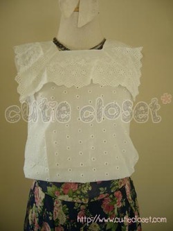 อีกหนึ่งไอเท็มที่สาวหวานขาดไม่ได้ค่ะ ตัวนี้เป็นเสื้อแขนกุดลูกไม้คอเหลี่ยมตกแต่งกระดุมด้านหลัง ผ้าไม่บางนะคะ เนื้อผ้าเป็นแบบฉลุค่ะใส่เก๋ๆ วันสบายๆ จะแมทช์กับกางเกงขาสั้น ขายาว หรือกระโปรงหวานๆก็เก๋กว่าใคร ใส่แล้วคุณหนูๆ มากๆ นะคะ แนะนำค่ะ อก ยืดได้ถึง 36" ยาว 22.5" http://www.cutiecloset.com/Products/productdetails.asp?category_id=1&product_id=200811909