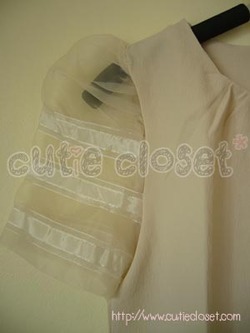เสื้อตัวนี้ทำจากผ้าเนื้อทรายที่ค่อนข้างหนาแต่ระบายอากาศได้ดี แพทเทิร์นเรียบหรูสไตล์คุณหนู คอเสื้อเป็นแบบคอกลมจับจีบ เก๋ที่แขนตกแต่งด้วยผ้ามุ้งและริบบิ้น ตัวเสื้อเป็นแบบพอดีตัวนะคะ ใส่กับกางเกงเอวสูงรับรองว่าเริ่ดกว่าใคร เก๋ๆ ด้วยกระดุมติดคอหนึ่งเม็ดด้านหลัง ตัวนี้คุณภาพดีเกินราคาค่ะ อก ยืดได้ถึง 34" ยาว 22.5" http://www.cutiecloset.com/Products/productdetails.asp?category_id=1&product_id=200812210