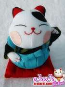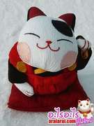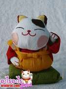 ขายตุ๊กตาแมวนำโชค (มาเนะคิเนะโกะ) สวมชุดโชกุน นั่งบนหมอน ทำจากผ้ากิโมโน ยกมือซ้ายกวัก สูงประมาณ 14.5 ซ.ม. กว้างประมาณ 11 ซ.ม.