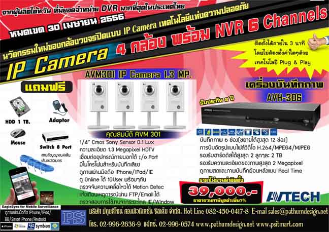 http://www.pathumdesign.net/product-th-0-4531785-โปรโมชั่น+IP+Camera+กล้องรุ่นAVM301+4กล้อง+พร้อมเครื่องบันทึกภาพNVR+6ช่อง+ติดตั้งได้ภายใน3+นาที.html#