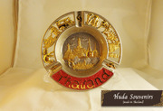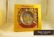 จานโชว์ สีทอง เนื้องานทำจากโลหะ ส่วนด้านบนนั้นเป็นลวดลายที่ชะหลุเป็นลวดลายต่างๆ รถตุ๊กๆ ช้าง รูปวัด ส่วนสีแดงตรงคำว่า Thailand นั้นเป็นเกร็ดทรายสีแดงโปรยรอบคำว่า Thailand สำหรับสินค้าตัวนี้จะมีขาตั้งโชว์เป็นแบบใสจะยิ่งทำให้ตัวจานโชว์นั้นเด่นขึ้น
