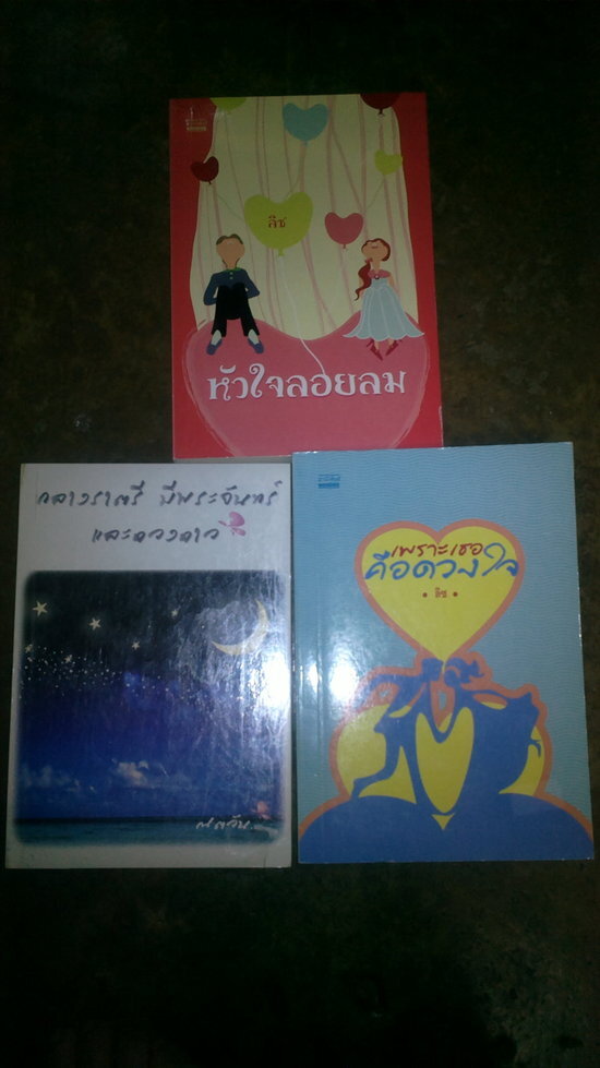 สั่งซื้อ 1 เล่ม คิดค่าส่ง 25 บาท เล่มต่อไปคิดเพิ่มอีก 5 บาท เพราะเธอคือดวงใจ / ลิซ / ราคาปก 255 / ขาย 160 มือสอง รักลอยลม / ลิซ / ราคาปก 170 / ขาย 100 มือสอง (มีรอยขีดที่สันปก) กลางราตรี มีพระจันทร์ และดวงดาว / ณตวัน / ราคาปก 160 / ขาย 110 (หนังสือใหม่ยังไม่แกะห่อ) สั่งครบสามเล่มคิดค่าจัดส่ง 30 บาท อยากดูรูปหนังสือเพิ่มติดต่อมาที่เมลได้ค่ะ