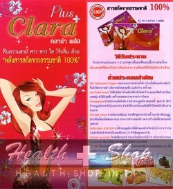 คลาร่า พลัส Clara+ Plus (โปรตีนสกัดจากถั่วเหลือง, สารสกัดจากทับทิม, สารสกัดจากเปลือกสน และโคเอนไซม์ คิวเท็น) “คาร่าพลัสรุ่นใหม่เข้มข้น เห็นผลเร็วกว่าเดิมเป็นสารสกัดละเอียดกว่าเดิมดูดซึมดีกว่าเดิม พร้อมเพิ่ม ความขาวใส กินแล้วผิวขาวผ่องพรรณ เห็นผลภายใน 1-2 กล่อง”