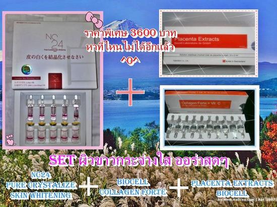 ผลลัพท์ใน 1 SET นี้ ช่วยปรับสภาพผิวของคุณ ให้ขาวขึ้น กระจ่างใสขึ้น รอยแผลเป็นต่างๆทั้งบนใบหน้าและลำตัว ผิวของคุณจะขาวใสและเป็นประกายวิ๊งๆ เมื่อโดนแสง ช่วยลดเลือน ริ้วรอย จุดด่างดำต่างๆ ริ้วรอยรอบดวงตา ใบหน้า รูขุมขนจะกระชับขึ้น ผิวเรียบเนียนทั้งใบหน้าและลำตัว ช่วยให้ผิวทั่วร่างกายดูเต่งตึงขึ้น เพิ่มความยืดหยุ่นให้กับผิวได้เป็นอย่างดี ส่งผลให้ผิวดูอ่อนเยาว์ขึ้น Set นี้ประกอบด้วย 1. NC24 Pure Crystalize Skin Whitening 1 กล่ิอง - วิตามินซี 1.25g/5ml จำนวน 5 หลอด - ผง Crystalize Tationil Powder 600mg จำนวน 5 หลอด 2. Placenta Extracts BioCell 1 กล่อง (10 amps) 3. Biocell Collagen Forte (10 amps) ชื่อเสียง NC24 โดดดังไปทั่วจากการใช้ของดาราญี่ปุ่นจำนวนมาก เช่น Ayumi Hamasaki, Ji - Xiang, Sawajiri Erika, Morning Musume และอื่น ๆ ด้วยเหตุผลที่ NC24 เวลาถูกแสงจะทำให้ผิวสะท้อนด้วยประกายออร่าแบบที่ไม่มีผลิตภัณฑ์ตัวใดทำได้ มาก่อน พวกดาราหน้ากล้องจึงนิยมใช้กันมาจนรวมทั้งหมู่พริตตี้อีกด้วย และที่สำคัญ NC24 กลับมียอดขายอันดับ 1 ในบรรยากลูต้าไธโอนทั้งหมดตั้งแต่ปี2006 จนถึงปัจจุบัณ 7 ข้อของ NC24 จากผู้ใช้ -- ผิวพรรณทั่วเรือนร่างขาวสะอาดตา เนียนเรียบใสมีออร่าประกายงดงาม -- แม้ฉีดเพียงครั้งแรกก็พบว่าออร่า และความแตกต่างที่สัมผัสได้ เช่น ผิวลื่นละมุนตา -- จุดด่างดำ รอยดำจางหายไปและพบได้ทุกๆ คนที่ใช้ -- ผู้ใช้ให้ความเห็นว่า ทำให้ผิวขาวขึ้น 1-2 เฉดสี อย่าง 100% -- ญี่ปุ่น เกาหลีใต้ และฮ่องกง มียอดการใช้สูงที่สุด -- ปลอดภัยไม่มีผลข้างเคียง -- โรงพยาบาลในกรุงโตเกียวยอมรับให้ใช้ได้ตามคลินิกทั่วไป