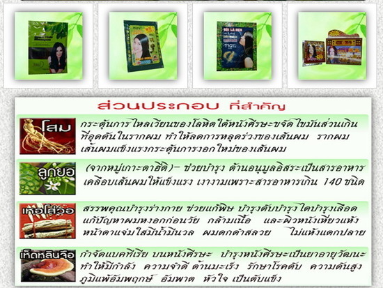 เห่อโส่วอู่ มีหน้าที่ในการช่วยสร้างสีให้กับเส้นผมให้มีความดำตามธรรมชาติ ตังกุย ช่วยลดปัญหาการหลุดร่วงของเส้นผม อันมีสาเหตุมาจากพันธุกรรม กระตุ้นระบบไหลเวียนเป็นสารต้านการเจริญเติบโตของเชื้อราบางชนิด เป็นยาแก้โรคผิวหนัง โสมจินเซ้ง มีสรรพคุณต่อต้านอนุมูลอิสระ, กระตุ้นการไหลเวียนของโลหิต, ป้องกันการเกิดเนื้องอก, ต่อต้านเชื้อไวรัส, ช่วยให้ร่างกายไม่อ่อนล้า และชะลอความชรา โสม ตังเซิน ป้องกันการหลุดร่วง และเร่งการงอกของเส้นผม มู่ฮั่นเหลียน ช่วยให้รากผมมีความแข็งแรง และทำให้เกร็ดผมสร้างเม็ดสีที่สมบูรณ์ ทำให้ผมหนา และดก ฮันนี่ โลกัส ฟรุ๊ต ,มลูแบรี่ ฟรุ๊ต,กรดซิตริกแอซิค เป็นตัวทำปฏิกิริยาเปิดเกร็ดผม งาดำ ช่วยให้เส้นผมมีความมันเงา ดำ และนุ่มสลวย