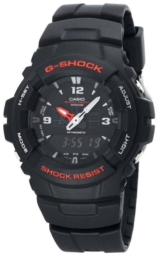 ขายด่วนๆ Casio Men's G100-1BV G-Shock Classic Ana-Digi Watch The Casio Story With the launch of its first watch in November 1974, Casio entered the wristwatch market at a time when the watch industry had just discovered digital technology. As a company with cutting-edge electronic technology developed for pocket calculators, Casio entered this field confident that it could develop timepieces that would lead the market. In developing its own wristwatches Casio began with the basic question, ""What is a wristwatch?"" Rather than simply making a digital version of the conventional mechanical watch, we thought that the ideal wristwatch should be something that shows all facets of time in a consistent way. Based on this, Casio was able to create a watch that displayed the precise time including the second, minute, hour, day, and month — not to mention a.m. or p.m., and the day of the week. It was the first watch in the world with a digital automatic calendar function that eliminated the need to reset the calendar due the variation in month length. Rather than using a conventional watch face and hands, a digital liquid crystal display was adopted to better show all the information. This culminated in the 1974 launch of the CASIOTRON, the world’s first digital watch with automatic calendar. The CASIOTRON won acclaim as a groundbreaking product that represented a complete departure from the conventional wristwatch.