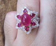 แหวนทับทิมพม่าหลังเบี้ยเนื้อแก้ว สีสวยมาก ทับทิมเม็ดกลางหนัก 1.35กะรัต ประดับด้วยทับทิมเจียรรอบ 0.92 กะรัต และเพชรเหลี่ยมเกสรน้ำขาว ไฟดี น้ำหนักเพชรรวม 1.32 กะรุัต วงนี้ทับทิมสีสวยหวานมาก ๆ ค่ะ
