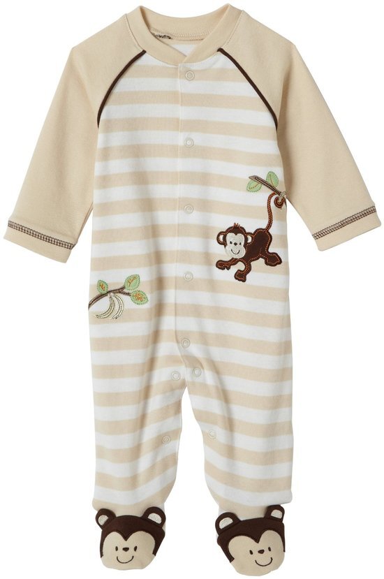 Little Me Baby Boy Monkey Stripe footed coverall with front snap closure. 100% cotton machine washable. Adorable stripe with raglan sleeve and monkey art on chest and foot treatment. Full inseam snap closure allows for easy changing.