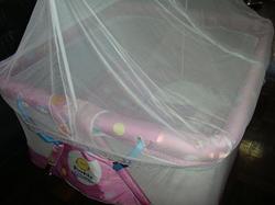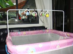 ขายเตียงเด็กพร้อมเบาะนุ่ม มีมุ้งและโมบายให้ พับได้