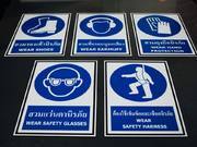 ป้ายสัญลักษณ์เพื่อความปลอดภัยประเภทต่าง ๆ เช่น อุปกรณ์ด้านการจราจร, ป้ายเตือนเพื่อความปลอดภัย, ป้ายเครื่องหมายสภาวะความปลอดภัย, ป้ายเครื่องหมายเตือน WARNING SIGNS, ป้ายเครื่องหมายบังคับ, ป้ายเครื่องหมายห้ามและป้องกันอัคคีภัย, ป้ายความปลอดภัย, ป้ายเรืองแสง สะท้อนแสง, ป้ายตั้งพื้น, ป้ายเครื่องหมายเสริม, ป้ายสถิติความปลอดภัย, ป้ายเครื่องหมายบังคับจราจร, ป้ายเครื่องหมายเตือน มีขนาดต่าง ๆ เช่น 10x45cm., 20x30cm., 15x30 cm., 20x45 cm. , 30x45 cm.,15x40 cm., 37.5x45 cm., 30x60 cm., 40x80 cm., 30x240 cm.,
