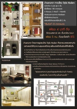 พื้นที่ใช้สอยขนาด 180 ตรม. 4 ห้องนอน 3 ห้องน้ำ 1 ส่วนรับแขก 1 ห้องรับประทานอาหาร 1 ห้องครัว ส่วนซักล้างที่กว้างขวาง พร้อมที่จอดรถคันใหญ่ได้ 4 คัน ราคาไม่แพงอย่างที่คิด บนเนื้อที่ดิน 33-50 ตารางวา