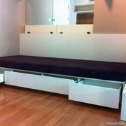 Built-In ทั้งห้อง - โซฟาใหญ่เต็มตัวใช้เป็น day bed หรือเตียงนอนแขกได้ มีตู้เก็บของและลิ้นชักหลายที่ ทีวีติดผนังห้องนั่งเล่นหมุนได้รอบ สามารถนอนดูได้จากเตียงในห้องนอน โต๊ะเครื่องแป้ง+โต๊ะเขียนหนังสือ ตู้เสื้อผ้า เตียงนอน ชั้นวางหนังสือ โต๊ะกินข้าวขยายขนาดได้ เคาน์เตอร์ครัวสำเร็จรูป