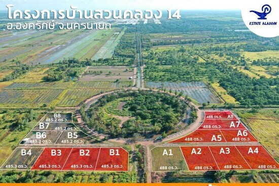 ขายที่ดินเปล่า ขนาด 488 ตร.วา แปลง A1 โครงการบ้านสวนคลอง 14 รอบวงเวียน องครักษ์ นครนายก ที่สวย เหมาะสร้างที่อยู่อาศัย