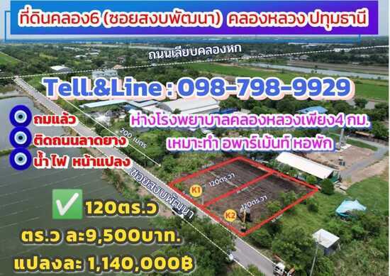 ขายด่วน #ที่ดินคลอง6(#ซอยสงบพัฒนา) คลองหลวง ปทุมธานี ✅เนื้อที120ตรว