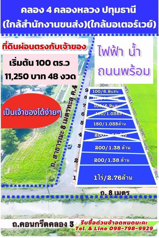 #ที่ดินเงินผ่อน #คลอง4 คลองหลวง ปทุมธานี(ใกล้มอเตอร์เวย์) 100ตร.ว 150 ตร.ว 200ตร.ว 1ไร่ เริ่มต้น690,000 ติดต่อคุณแอน โทร .098-798-9929