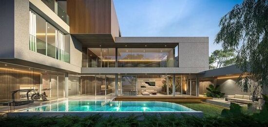 * ห้องรับแขก ห้องอาหาร และ ครัวฝรั่ง บนพื้นที่เปิดกว้าง เห็นวิวสระน้ำได้ชัดเจน