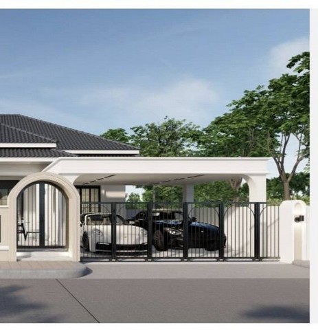 บ้านเดี่ยวชั้นเดียว สไตล์โมเดิร์นคลาสสิก (Modern Classic ) ฝ้าเพดานโปร่งโล่ง ขนาดที่ดิน 76 ตารางวา 3 ห้องนอน 4 ห้องน้ำ