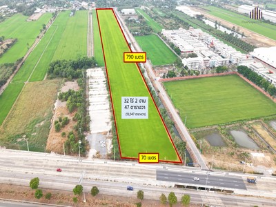 ขายที่ดินเปล่า ติดถนน 3 ด้าน!! แปลงสี่เหลี่ยมสวย ขายที่ดิน 32 ไร่เศษ กาญจนาภิเษก คลองกำนันเยื้อน คลองพระอุดม ลาดหลุมแก้ว